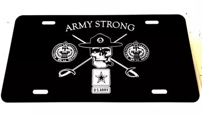 Army Strong Drill Sergeant Tag Diamond Etched on Black Aluminum License Plate. Made in the USA Our license plates are made from aluminum and will not rust. They are painted with a high performance baked on enamel finish. We use a laser engraving process, so no worries about peeling or fading. The laser actually removes the paint to expose the aluminum metal, making for a plate that will last for years. We guarantee it! ~Made from .040 aluminum, not .025, our tags are almost twice as thick as others. ~Fits any standard size 12"x 6" mount with four slots as pictured. -includes screw caps and screws ~Plates are made to order and usually ship within 24 hours. Makes a great gift!