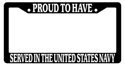 Black License Plate Frame Proud To Have Served In The United States Navy Auto Proud To Have Served In The United States Navy Black license plate frame made from high impact ABS plastic, covered with color vinyl printing. This frame is designed to last. These frames will last longer than your car.