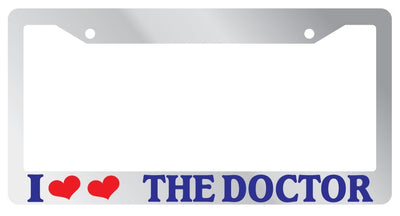 Chrome License Plate Frame I Heart Heart The Doctor Navy One Line Doctor Who I Heart Heart The Doctor Chrome license plate frame made from high impact ABS plastic, chrome plated, and covered with color vinyl printing. This frame is designed to last. Steel chrome frames when they get scratched will rust and rot away. These frames will last longer than your car.