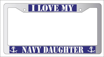 Chrome License Plate Frame I LOVE MY NAVY DAUGHTER(BLUE) Auto Accessory Chrome license plate frame I LOVE MY NAVY DAUGHTER(BLUE) made from high impact ABS plastic, chrome plated, and covered with color vinyl printing. This frame is designed to last. Steel chrome frames when they get scratched will rust and rot away. These frames will last longer than your car.