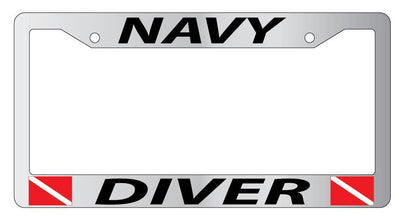 Chrome License Plate Frame NAVY DIVER w/FLAGS Auto Accessory Chrome license plate frame NAVY DIVER w/FLAGS made from high impact ABS plastic, chrome plated, and covered with color vinyl printing. This frame is designed to last. Steel chrome frames when they get scratched will rust and rot away. These frames will last longer than your car.