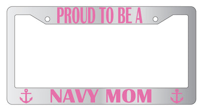 Chrome License Plate Frame "Proud To Be A Navy Mom" Auto Accessory Novelty " Proud To Be A Navy Mom " Chrome license plate frame made from high impact platable ABS. Covered with color vinyl printing. This frame is designed to last. Steel chrome frames when they get scratched will rust and rot away. These frames will last longer than your car.