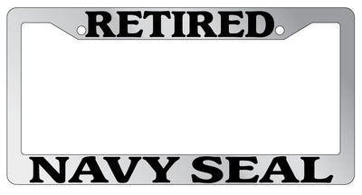 Chrome METAL License Plate Frame RETIRED NAVY SEAL Auto Accessory Chrome Metal license plate frame RETIRED NAVY SEAL made from high quality steel plated in chrome, covered with premium outdoor color vinyl printing with a minimum life expectancy of 7 year. The vinyl is designed to stand up to the elements and will not peel off in car washes or other elements your car may be subjected to. This frame is designed to last. Designed to withstand outdoor conditions We do all kinds of different products.