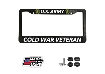 BRAND NEW Cold War VET BLACK LICENSE PLATE FRAME GREAT FOR ALL CARS, TRUCKS * SUVS! FRAMES ARE MADE AND SHIPPED FROM THE USA . HIGH PERFORMANCE DIGITALLY PRINTED/LAMINATED VINYL IS MOUNTED TO THE BLACK FRAMES TO GIVE IT ITS UNIQUE APPEARANCE FRAMES ARE MADE OF ABS BLACK PLASTIC.FRAMES ARE UNIVERSAL FIT FOR ANY STANDARD US LICENSE PLATE. FREE SHIPPING IN THE US VIA USPS FIRST CLASS W/ TRACKING!