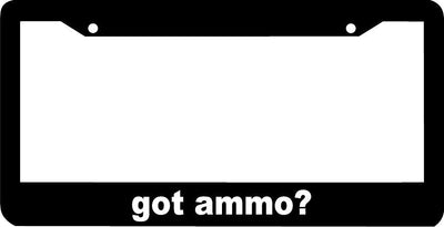 got ammo? License Plate Frame Plastic License Plate Frame Polystyrene plastic with vinyl graphics. Strong with tabs on the back to secure your plate to the frame. This is a buy it now for the frame pictured It is designed to fit a US/CANADA license plate.