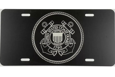 NEW US Coast Guard A1 Seal Laser Engraved License Plate Car Tag Gift Flat Black. Made in the USA Our license plates are made from aluminum and will not rust. They are painted with a high performance baked on enamel finish. We use a laser engraving process, so no worries about peeling or fading. The laser actually removes the paint to expose the aluminum metal, making for a plate that will last for years. We guarantee it! ~Made from .040 aluminum, not .025, our tags are almost twice as thick as others. ~Fits any standard size 12"x 6" mount with four slots as pictured. -includes screw caps and screws ~Plates are made to order and usually ship within 24 hours. Makes a great gift!