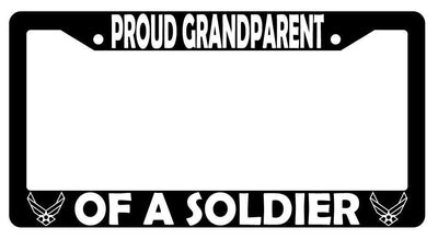Proud Grandparent Of A Soldier (Air Force) Black Plastic License Plate Frame Proud Grandparent Of A Soldier (Air Force) Black Plastic License Plate Frame Description Proud Grandparent Of A Soldier (Air Force) Black license plate frame made from high impact ABS plastic, covered with color vinyl printing. This frame is designed to last. These frames will last longer than your car.