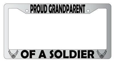 Proud Grandparent Of A Soldier (Air Force) Chrome Plastic License Plate Frame Proud Grandparent Of A Soldier (Air Force) Chrome Plastic License Plate Frame Description Proud Grandparent Of A Soldier (Air Force) Chrome Plastic license plate frame made from high impact ABS plastic, chrome plated, and covered with color vinyl printing. This frame is designed to last. Steel chrome frames when they get scratched will rust and rot away. These frames will last longer than your car.