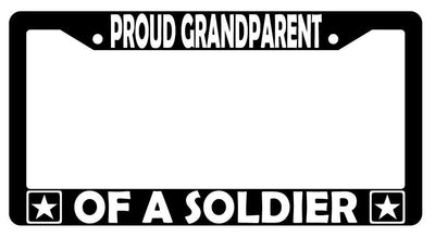 Proud Grandparent Of A Soldier (Army) Black Plastic License Plate Frame Proud Grandparent Of A Soldier (Army) Black Plastic License Plate Frame Description Proud Grandparent Of A Soldier (Army) Black license plate frame made from high impact ABS plastic, covered with color vinyl printing. This frame is designed to last. These frames will last longer than your car.