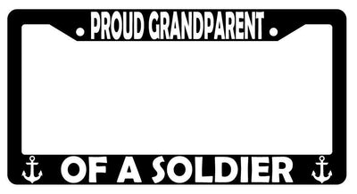 Proud Grandparent Of A Soldier (Navy) Black Plastic License Plate Frame Proud Grandparent Of A Soldier (Navy) Black Plastic License Plate Frame Description Proud Grandparent Of A Soldier (Navy) Black license plate frame made from high impact ABS plastic, covered with color vinyl printing. This frame is designed to last. These frames will last longer than your car.