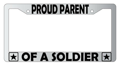 Proud Parent Of A Soldier (Army) Chrome Plastic License Plate Frame Proud Parent Of A Soldier (Army) Chrome Plastic License Plate Frame Description Proud Parent Of A Soldier (Army) Chrome Plastic license plate frame made from high impact ABS plastic, chrome plated, and covered with color vinyl printing. This frame is designed to last. Steel chrome frames when they get scratched will rust and rot away. These frames will last longer than your car.