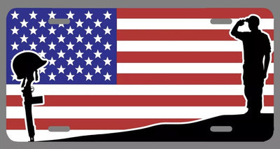 USA American Flag Soldier Metal License Plate Military Gifts Army Navy Marines. Premium Quality Plate 6-Inch By 12-Inch Standard Size License Plate Add Some Style to Your Ride! Proudly Made in the USA ; Family-Owned and Operated Business