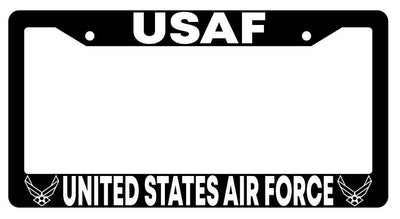 USAF United States Air Force Black Plastic License Plate Frame USAF United States Air Force Black Plastic License Plate Frame Description USAF United States Air Force Black license plate frame made from high impact ABS plastic, covered with color vinyl printing. This frame is designed to last. These frames will last longer than your car.