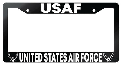 USAF United States Air Force Glossy Black Plastic License Plate Frame USAF United States Air Force Glossy Black Plastic License Plate Frame Description USAF United States Air Force Glossy Black Plastic license plate frame made from high impact ABS plastic, covered with color vinyl printing. This frame is designed to last. These frames will last longer than your car.