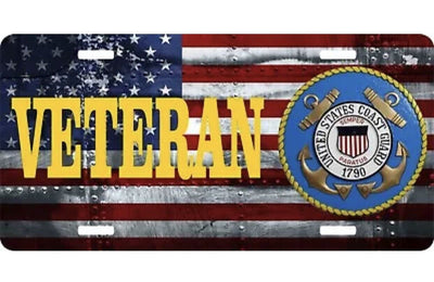 Veteran United States Coast Guard License Plate 6" x 12" Made in USA by Veterans. Premium Quality High gloss aluminum with UV protective coating. Not cheap plastic. Suitable for outside or inside use. Will not rust. 6"H x 12"W Rounded corners Pre drilled holes in each corner for mounting. Hardware not included High quality detailed sublimated printing that becomes part of the aluminum. This is NOT vinyl lettering. Great for business, garage, recreation room, man cave, driveways or anywhere else that needs a sign. Made in the USA.