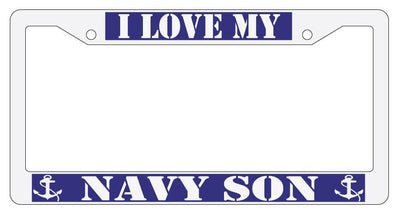 WHITE License Plate Frame I LOVE MY NAVY SON Auto Accessory WHITE license plate frame I LOVE MY NAVY SON made from high impact ABS plastic, covered with color vinyl printing. This frame is designed to last. These frames will last longer than your car.