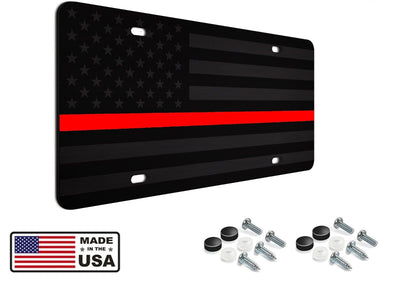 Thin Red Line Firefighter American Flag License Plate Tactical Black w Screw Cap