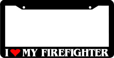 I LOVE MY FIREFIGHTER License Plate Frame Plastic License Plate Frame Polystyrene plastic with vinyl graphics. Strong with tabs on the back to secure your plate to the frame. This is a buy it now for the frame pictured It is designed to fit a US/CANADA license plate.
