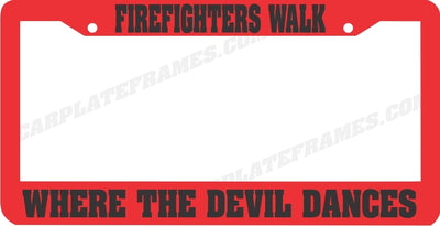 FIREFIGHTERS WALK WHERE THE DEVIL DANCES License Plate Frame Plastic License Plate Frame Polystyrene plastic with vinyl graphics. Strong with tabs on the back to secure your plate to the frame. This is a buy it now for the frame pictured It is designed to fit a US/CANADA license plate.