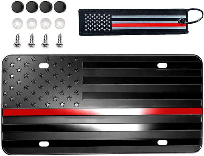Show your support for firefighters with this stylish Thin Red Line American Flag license plate. Measuring 6 inches in height and 12 inches in length, this aluminum plate is perfect for front placement on any car. The flag theme displays patriotic pride while the brand BLVD ensures quality. This license plate is universal fitment and suitable for any car. The country of manufacture is the United States and there is no warranty. Brand New Handmade In The USA Using The Highest Quality Aluminum Metal and Ink. These License Plates Have A UV Protective Coating And We Use UV Resistant Ink So The Plate Will Last For Years Without Fading Or Rusting. The Plate Measures 6"x12" (6 inches by 12 inches). Standard Size For All Vehicles There Are Four Holes For Easy Mounting. These Are Flat Not Embossed. American Flag Thin Red Line Firefighter Design Package Includes 1 License Plate 1 Key Chain 4 Screw Caps 4 Screws