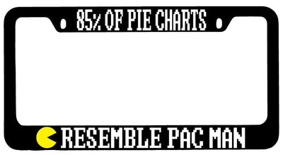 85% Of Pie Charts Resemble Pac Man Black METAL License Plate Frame 85% Of Pie Charts Resemble Pac Man Black METAL License Plate Frame Description 85% Of Pie Charts Resemble Pac Man Black Metal license plate frame made from high quality steel, covered with premium outdoor color vinyl printing with a minimum life expectancy of 7 year. The vinyl is designed to stand up to the elements and will not peel off in car washes or other elements your car may be subjected to. This frame is designed to last. Designed to withstand outdoor conditions We do all kinds of different products.
