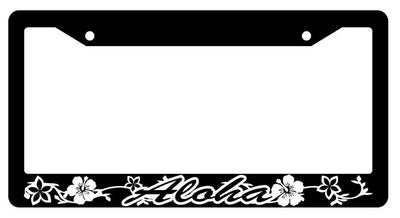 Aloha (Flower Vine) Black Plastic License Plate Frame Auto Accessory Aloha (Flower Vine) Black Plastic License Plate Frame Auto Accessory Description Aloha (Flower Vine) Black license plate frame made from high impact ABS plastic, covered with color vinyl printing. This frame is designed to last. These frames will last longer than your car.