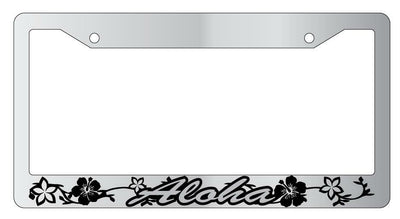 Aloha (Flower Vine) Chrome Plastic License Plate Frame Auto Accessory Aloha (Flower Vine) Chrome Plastic License Plate Frame Auto Accessory Description Aloha (Flower Vine) Chrome Plastic license plate frame made from high impact ABS plastic, chrome plated, and covered with color vinyl printing. This frame is designed to last. Steel chrome frames when they get scratched will rust and rot away. These frames will last longer than your car.
