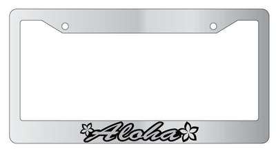 Aloha (Plumeria) Chrome Plastic License Plate Frame Auto Accessory Aloha (Plumeria) Chrome Plastic License Plate Frame Auto Accessory Description Aloha (Plumeria) Chrome Plastic license plate frame made from high impact ABS plastic, chrome plated, and covered with color vinyl printing. This frame is designed to last. Steel chrome frames when they get scratched will rust and rot away. These frames will last longer than your car.