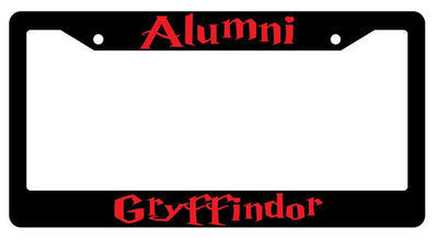 Alumni Gryffindor Black Plastic License Plate Frame Alumni Gryffindor Black Plastic License Plate Frame Description Alumni Gryffindor Black license plate frame made from high impact ABS plastic, covered with color vinyl printing. This frame is designed to last. These frames will last longer than your car.