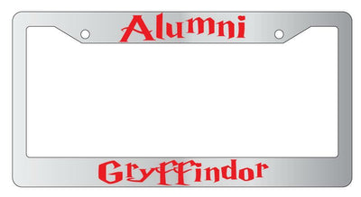 Alumni Gryffindor Chrome Plastic License Plate Frame Alumni Gryffindor Chrome Plastic License Plate Frame Description Alumni Gryffindor Chrome Plastic license plate frame made from high impact ABS plastic, chrome plated, and covered with color vinyl printing. This frame is designed to last. Steel chrome frames when they get scratched will rust and rot away. These frames will last longer than your car.