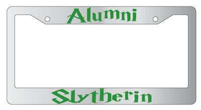 Alumni Slytherin Chrome Plastic License Plate Frame Alumni Slytherin Chrome Plastic License Plate Frame Description Alumni Slytherin Chrome Plastic license plate frame made from high impact ABS plastic, chrome plated, and covered with color vinyl printing. This frame is designed to last. Steel chrome frames when they get scratched will rust and rot away. These frames will last longer than your car.