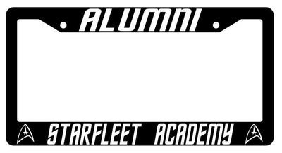 Alumni Starfleet Academy Black Plastic License Plate Frame Star Trek Alumni Starfleet Academy Black Plastic License Plate Frame Description Alumni Starfleet Academy Black license plate frame made from high impact ABS plastic, covered with color vinyl printing. This frame is designed to last. These frames will last longer than your car.