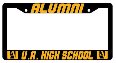 Alumni UA High School Black Plastic License Plate Frame MHA Alumni UA High School Black Plastic License Plate Frame MHA Description Alumni UA High School Black license plate frame made from high impact ABS plastic, covered with color vinyl printing. This frame is designed to last. These frames will last longer than your car.