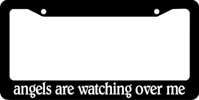 ANGELS ARE WATCHING OVER ME License Plate Frame Plastic License Plate Frame Polystyrene plastic with vinyl graphics. Strong with tabs on the back to secure your plate to the frame. This is a buy it now for the frame pictured It is designed to fit a US/CANADA license plate.