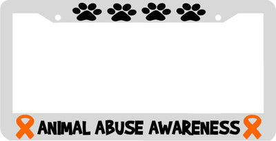 ANIMAL ABUSE Awareness License Plate Frame Plastic License Plate Frame Polystyrene plastic with vinyl graphics. Strong with tabs on the back to secure your plate to the frame. This is a buy it now for the frame pictured It is designed to fit a US/CANADA license plate.