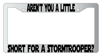 Aren't You A Little Short For A For Stormtrooper Chrome Plastic License Frame SW Aren't You A Little Short For A For Stormtrooper Chrome Plastic License Frame SW Description Aren't You A Little Short For A For Stormtrooper Chrome Plastic license plate frame made from high impact ABS plastic, chrome plated, and covered with color vinyl printing. This frame is designed to last. Steel chrome frames when they get scratched will rust and rot away. These frames will last longer than your car.