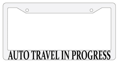 Auto Travel In Progress White Plastic License Plate Frame MMO Auto Travel In Progress White Plastic License Plate Frame MMO Description Auto Travel In Progress White Plastic License Plate Frame MMO Black license plate frame made from high impact ABS plastic, covered with color vinyl printing. This frame is designed to last. These frames will last longer than your car.