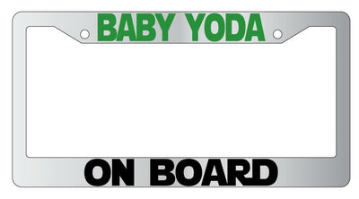 Baby Yoda On Board Chrome Plastic License Frame SW Baby Yoda On Board Chrome Plastic License Frame SW Description Baby Yoda On Board Chrome Plastic license plate frame made from high impact ABS plastic, chrome plated, and covered with color vinyl printing. This frame is designed to last. Steel chrome frames when they get scratched will rust and rot away. These frames will last longer than your car.