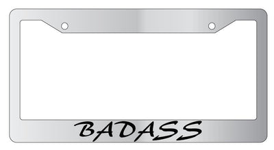 Badass (Cursive) Chrome METAL License Plate Frame Auto Accessory Badass (Cursive) Chrome METAL License Plate Frame Auto Accessory Description Badass (Cursive) Chrome Metal license plate frame made from high quality steel plated in chrome, covered with premium outdoor color vinyl printing with a minimum life expectancy of 7 year. The vinyl is designed to stand up to the elements and will not peel off in car washes or other elements your car may be subjected to. This frame is designed to last. Designed to withstand outdoor conditions We do all kinds of different products.