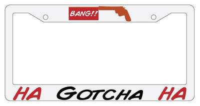 Bang Gotcha White Plastic License Plate Frame Bang Gotcha White Plastic License Plate Frame Description Bang Gotcha White Plastic License Plate Frame Auto White license plate frame made from high impact ABS plastic, covered with color vinyl printing. This frame is designed to last. These frames will last longer than your car.