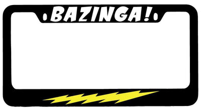 Bazinga Black METAL License Plate Frame Big Bang Theory Bazinga Black METAL License Plate Frame Big Bang Theory Description Bazinga Black Metal license plate frame made from high quality steel, covered with premium outdoor color vinyl printing with a minimum life expectancy of 7 year. The vinyl is designed to stand up to the elements and will not peel off in car washes or other elements your car may be subjected to. This frame is designed to last. Designed to withstand outdoor conditions We do all kinds of different products.