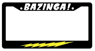Bazinga! Black Plastic License Plate Frame Big Bang Theory Bazinga! Black Plastic License Plate Frame Big Bang Theory Description Bazinga! Black license plate frame made from high impact ABS plastic, covered with color vinyl printing. This frame is designed to last. These frames will last longer than your car.