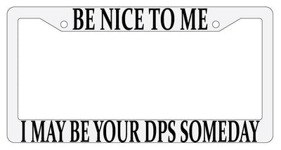 Be Nice To Me I May Be Your DPS Someday White Plastic License Plate Frame MMO Be Nice To Me I May Be Your DPS Someday White Plastic License Plate Frame MMO Description Be Nice To Me I May Be Your DPS Someday White Plastic License Plate Frame MMO Black license plate frame made from high impact ABS plastic, covered with color vinyl printing. This frame is designed to last. These frames will last longer than your car.
