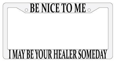 Be Nice To Me I May Be Your Healer Someday White Plastic License Plate Frame MMO Be Nice To Me I May Be Your Healer Someday White Plastic License Plate Frame MMO Description Be Nice To Me I May Be Your Healer Someday White Plastic License Plate Frame MMO Black license plate frame made from high impact ABS plastic, covered with color vinyl printing. This frame is designed to last. These frames will last longer than your car.