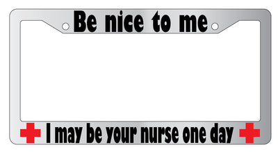 Be Nice To Me I May Be Your Nurse BLACK (Design 2a) Chrome Plastic License Frame Be Nice To Me I May Be Your Nurse Someday Chrome license plate frame made from high impact ABS plastic, chrome plated, and covered with color vinyl printing. This frame is designed to last. Steel chrome frames when they get scratched will rust and rot away. These frames will last longer than your car.