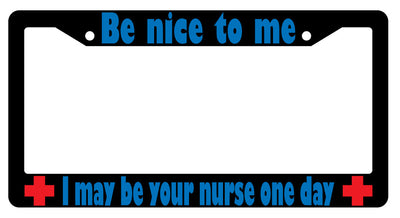Be Nice To Me I May Be Your Nurse BLUE (Design 2a) Black Plastic License Frame Be Nice To Me I May Be Your Nurse Someday Black license plate frame made from high impact ABS plastic, covered with color vinyl printing. This frame is designed to last. These frames will last longer than your car.