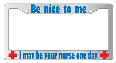 Be Nice To Me I May Be Your Nurse BLUE (Design 2a) Chrome Plastic License Frame Be Nice To Me I May Be Your Nurse Someday Chrome license plate frame made from high impact ABS plastic, chrome plated, and covered with color vinyl printing. This frame is designed to last. Steel chrome frames when they get scratched will rust and rot away. These frames will last longer than your car.