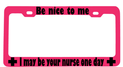Be Nice To Me I May Be Your Nurse One Day Design 2a(BK) Pink METAL License Frame Pink Metal license plate frame BE NICE I MIGHT BE YOUR NURSE SOMEDAY! made from high quality Anodized Zinc, covered with premium outdoor color vinyl printing with a minimum life expectancy of 7 year. The vinyl is designed to stand up to the elements and will not peel off in car washes or other elements your car may be subjected to. This frame is designed to last. Designed to withstand outdoor conditions We do all kinds of different products.