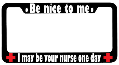 Be Nice To Me I May Be Your Nurse One Day Design 2a Black METAL License Frame Black Metal license plate frame Be Nice To Me I May Be Your Nurse Someday made from high quality steel, covered with premium outdoor color vinyl printing with a minimum life expectancy of 7 year. The vinyl is designed to stand up to the elements and will not peel off in car washes or other elements your car may be subjected to. This frame is designed to last. Designed to withstand outdoor conditions We do all kinds of different products.