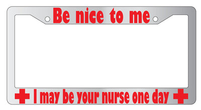 Be Nice To Me I May Be Your Nurse RED (Design 2a) Chrome Plastic License Frame Be Nice To Me I May Be Your Nurse Someday Chrome license plate frame made from high impact ABS plastic, chrome plated, and covered with color vinyl printing. This frame is designed to last. Steel chrome frames when they get scratched will rust and rot away. These frames will last longer than your car.